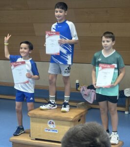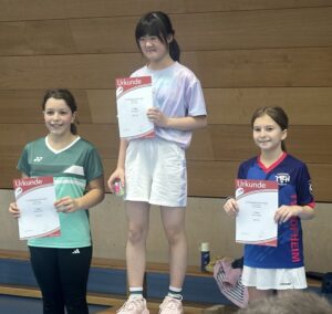 Der zweite Turniertag begann für die BVG’ler mit einer Absage von Ziling Ma, die im Mädcheneinzel U13 mit Setzplatz eins ins Rennen gegangen wäre. Indirekt profitierte Mathilda Pfarr davon, die in einem Marathonturnier fünf ihrer sechs Spiele deutlich gewann und sich nur der Turnsiegerin geschlagen geben musste. Bei den Jungen U13 hatten Luca Heck und Daniel Bieber einen schweren Stand, denn sie konnten bisher kaum Turnier- bzw. Wettkampferfahrung aufweisen und unterlagen in der Auftaktrunde. In ihren Platzierungsspielen gab es dann ausgeglichenere Spiele mit einem geteilten 11. Platz am Ende. In der Altersklasse U11 gab es am Ende einen vierten und einen fünften Platz für die BVG, trotz unterschiedlicher Ausgangspositionen. Sinje Hessler musste als einzige BVG’lerin in der Startrunde ran und siegte mit 21:14 / 18:21 / 21:18 knapp. In Runde zwei hätte sie fast die spätere Drittplatzierte ausgeschaltet (20:22 / 25:23 / 19:21). Carolina Carstens und Lina Cai standen schon in Runde zwei, in der Carolina mit 0:2 der Turniersiegerin unterlag, während Lina noch ein Freilos bekam und somit im Halbfinale stand. Dort unterlag sie mit 5:21 / 6:21. Auch das Spiel um Platz drei ging für sie verloren. In der Platzierungsrunde trafen Carolina und Sinje aufeinander. Sinje konnte das Vereinsduell mit 21:14 / 21:13 gewinnen und das anschließende Spiel um Platz fünf ebenfalls. Carolina wurde am Ende Siebte. Gleich 19 Jungs gingen insgesamt in der U11 an den Start. Die BVG war gleich mit vier Spielern vertreten. Die Startrunde überstand aber nur Mattis Pfarr, der bis ins Halbfinale kam. Gegen Turniersieger Schneider (SG Bremthal) unterlag Mattis mit 11:21 / 7:21, holte sich aber, nach einem spannenden Duell noch Platz drei mit 20:22 / 21:19 / 21:10. Sein Gegner im kleinen Finale war zum Auftakt der Gewinner gegen Karl Kraft. Auch Tobias Bieber und Eliah Staab spielten in der Platzierungsrunde weiter. Dort gab es leider eine reine Vereinsveranstaltung, denn die drei Jungs spielten gegeneinander.